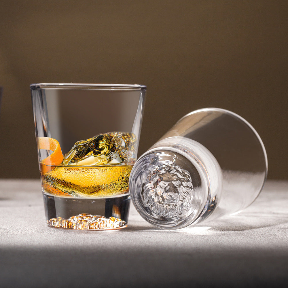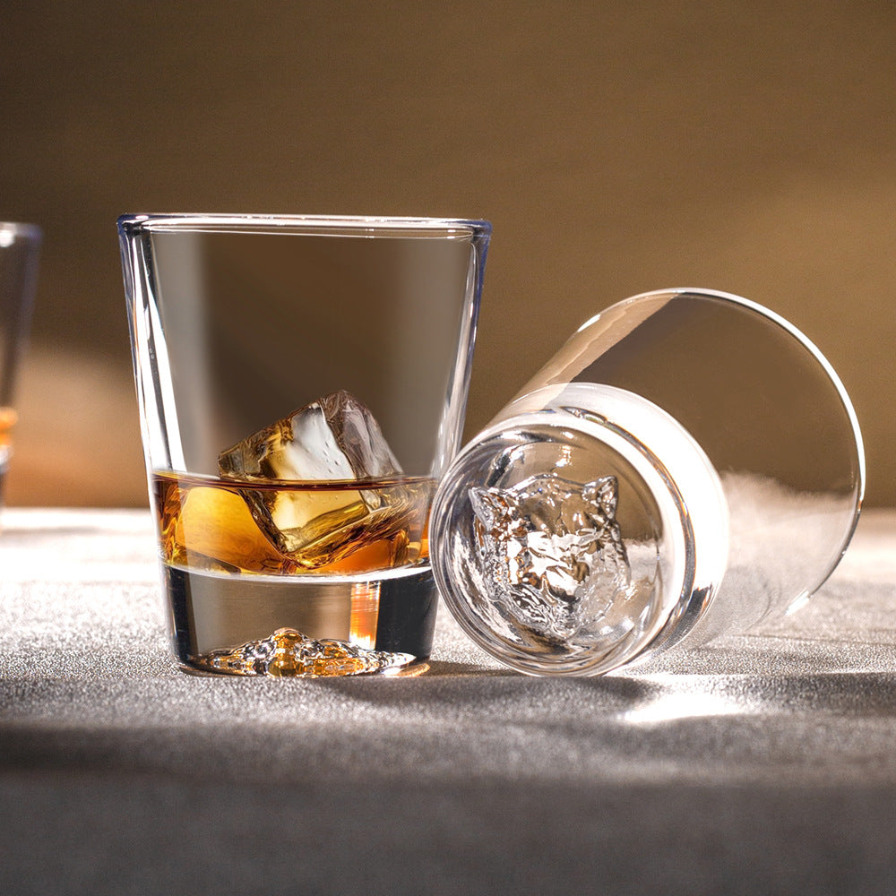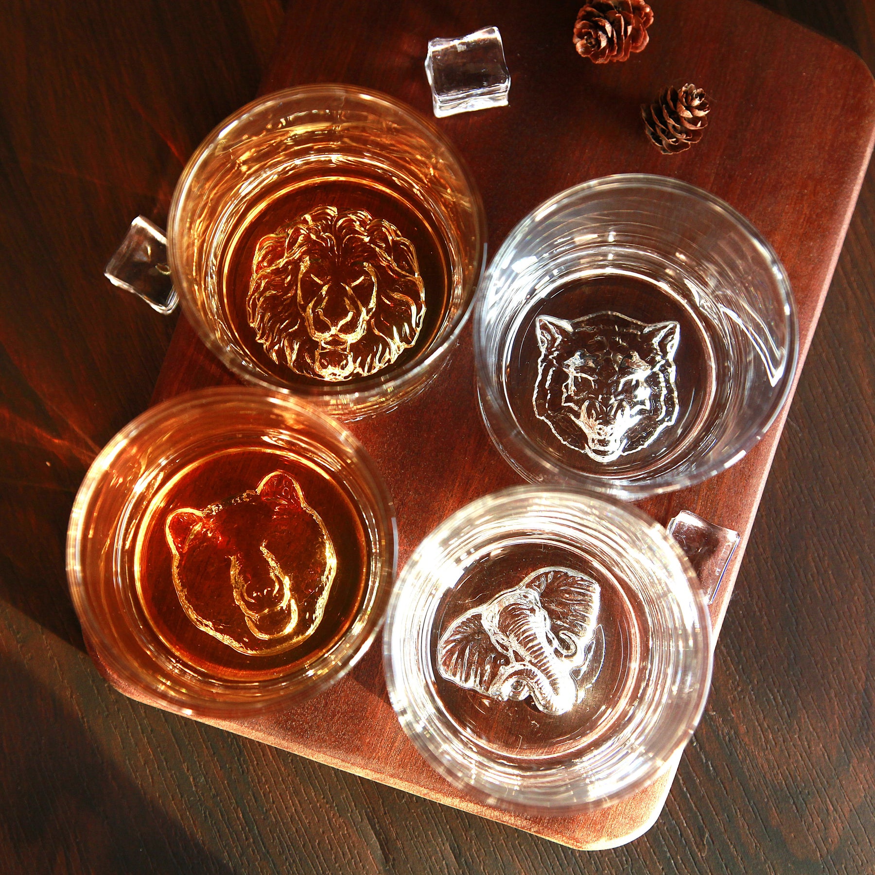 This set of 4 whiskey glasses combines a smooth and transparent body with a unique base: each glass has a detailed 3D sculpture of an animal head - elephant, lion, wolf, or bear - adding a unique wild elegance and symbolic power to each glass.