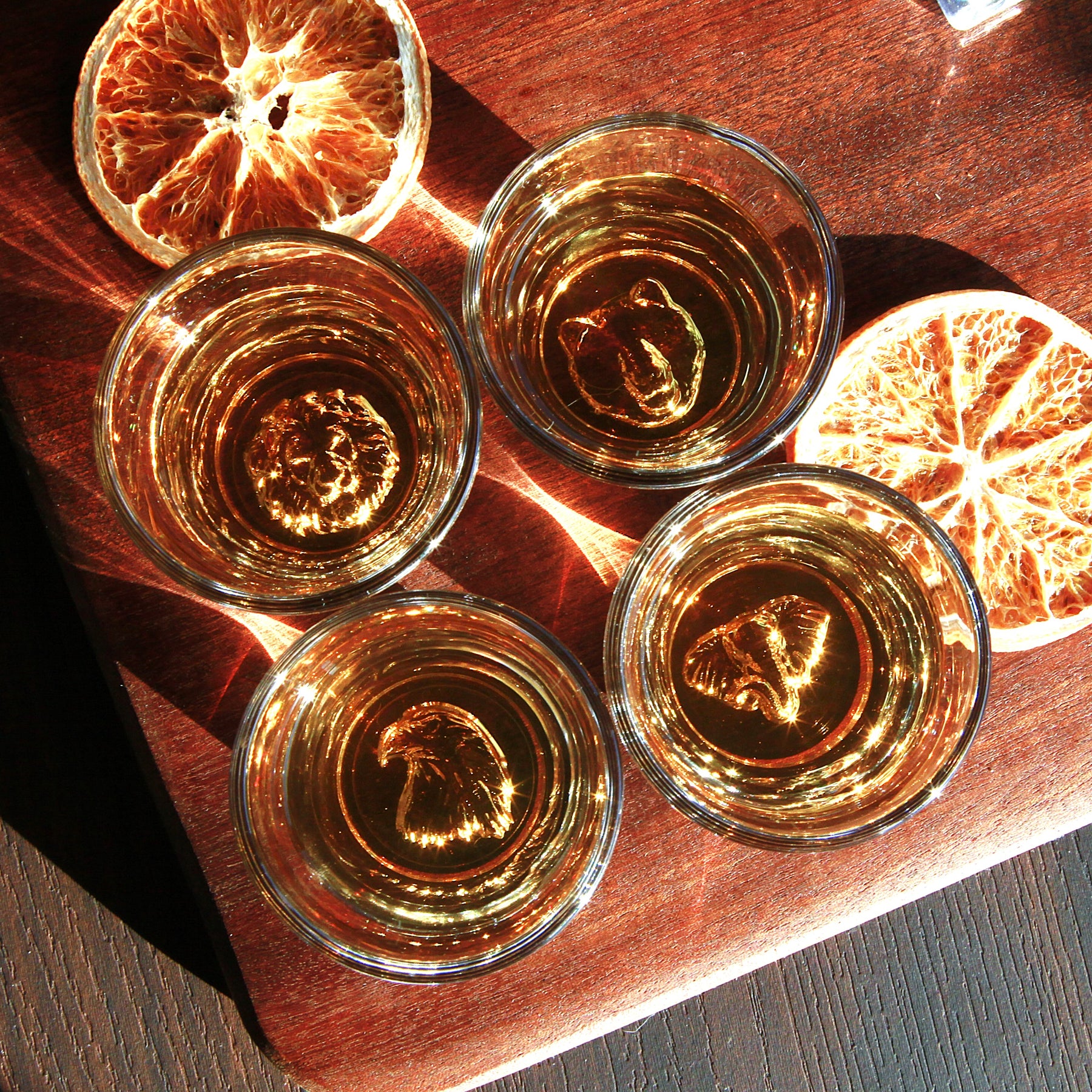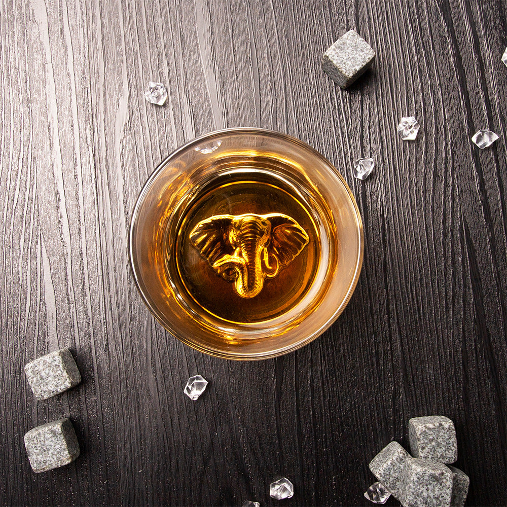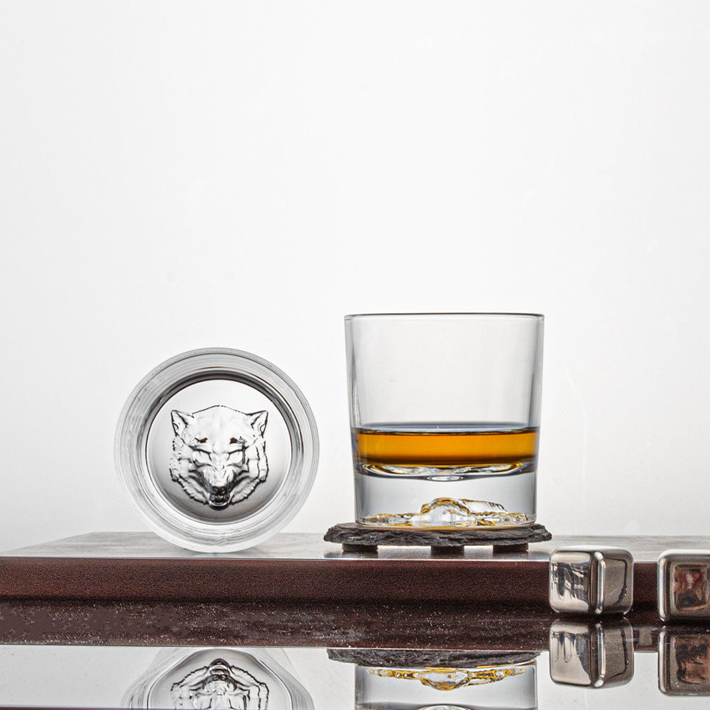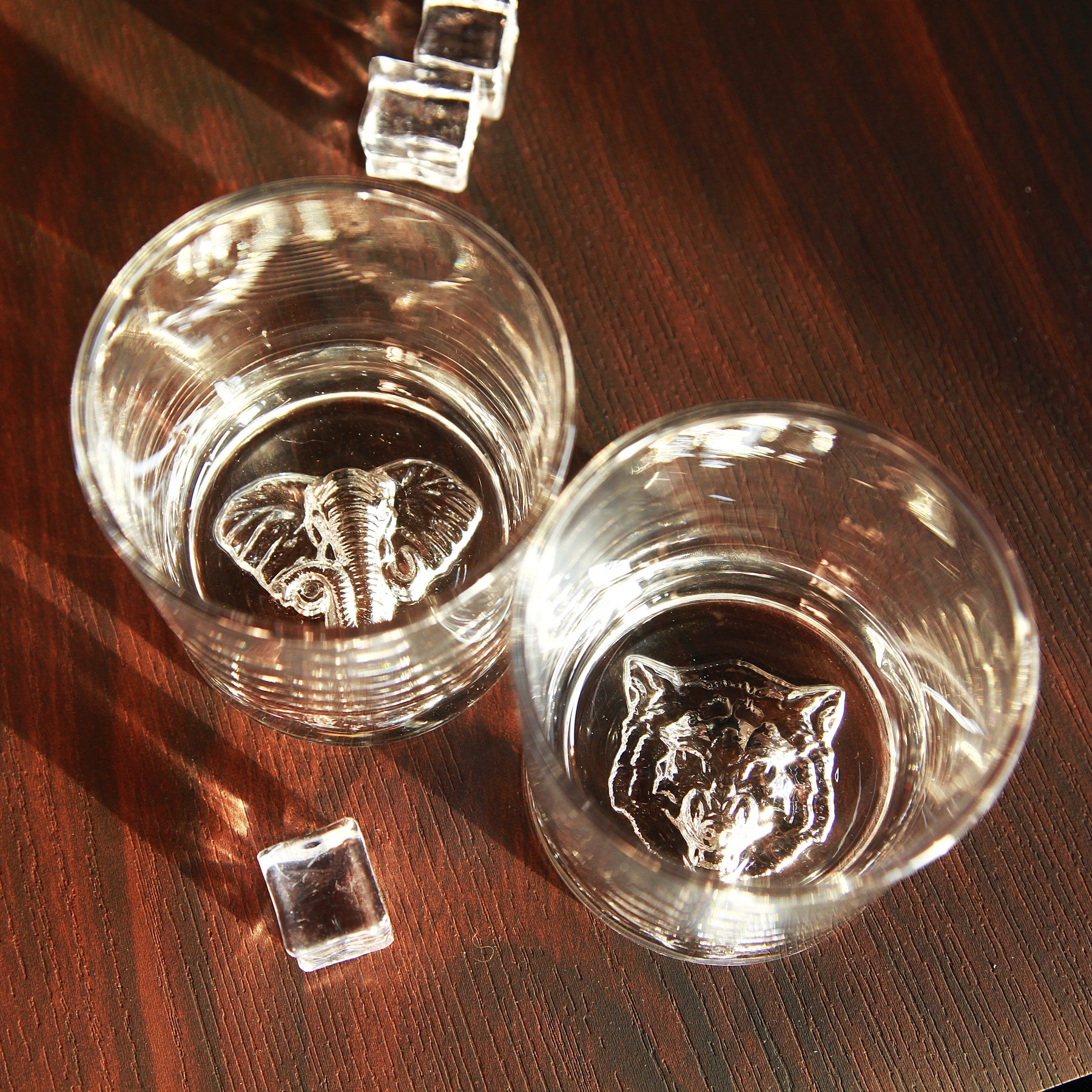 This set of 4 whiskey glasses combines a smooth and transparent body with a unique base: each glass has a detailed 3D sculpture of an animal head - elephant, lion, wolf, or bear - adding a unique wild elegance and symbolic power to each glass.