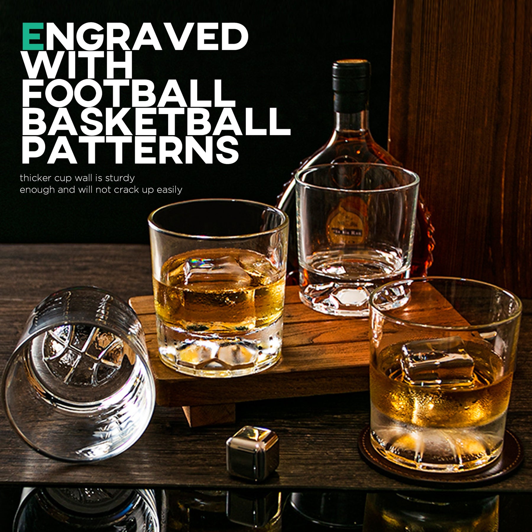 This set of 4 whiskey glasses combines a smooth and transparent body with a unique base: each glass has a detailed ball sports sculpture - the 3D logo of football, basketball, tennis, and golf, adding a unique athletic elegance to each glass.