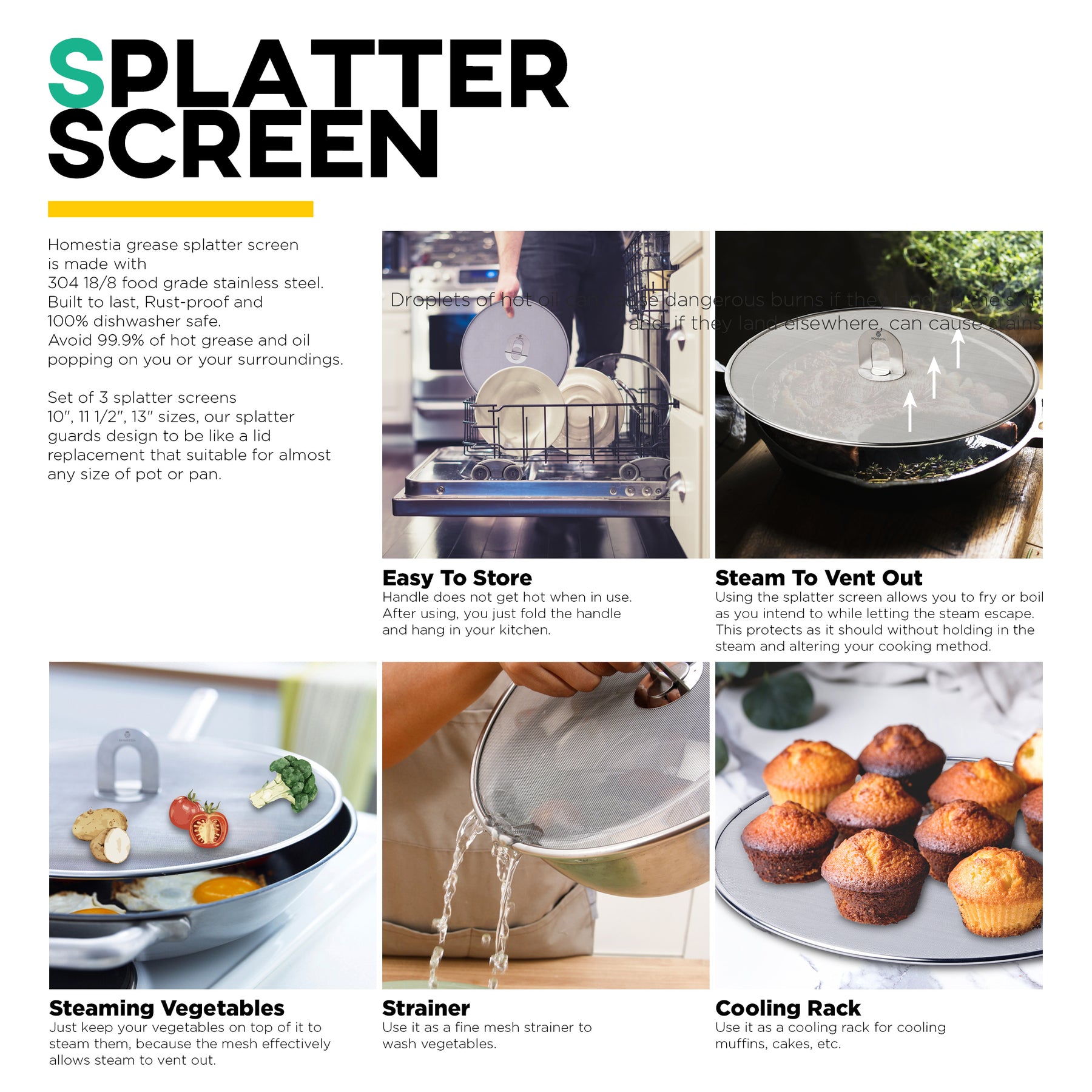 Homestia 3PCS Stainless Steel Splatter Screen Set, 10" / 11.5" / 13"