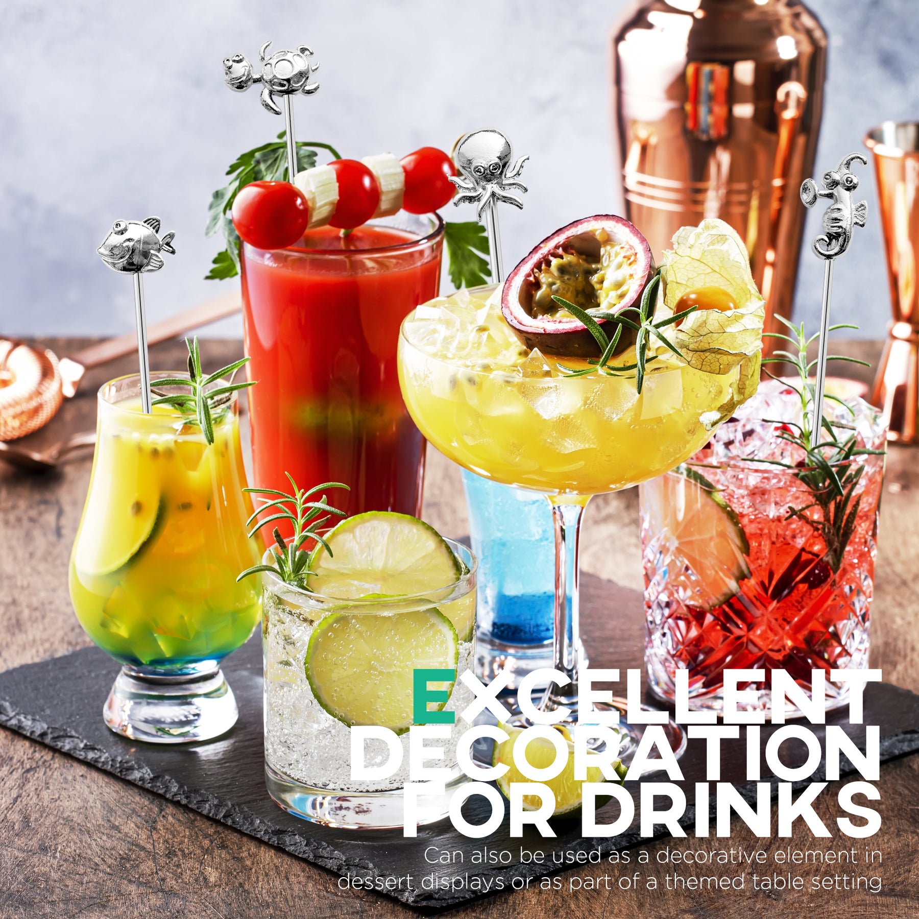 Stunning skull cocktail swizzle stiring sticks to serve your cocktails in style. Drawing inspiration from the medieval retro style, each is topped by skull head design and finished in a gleaming metallic luster.