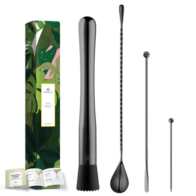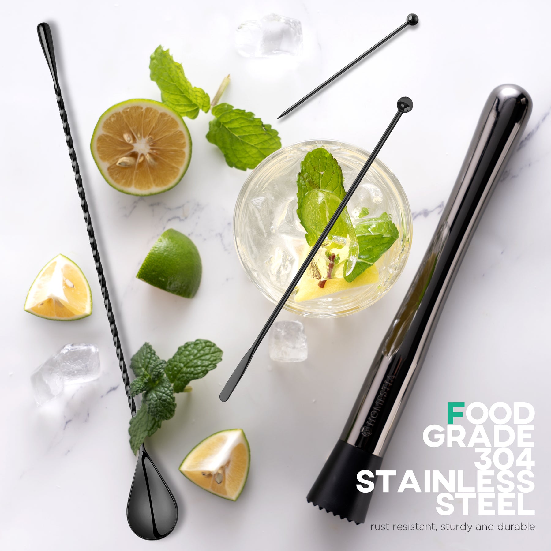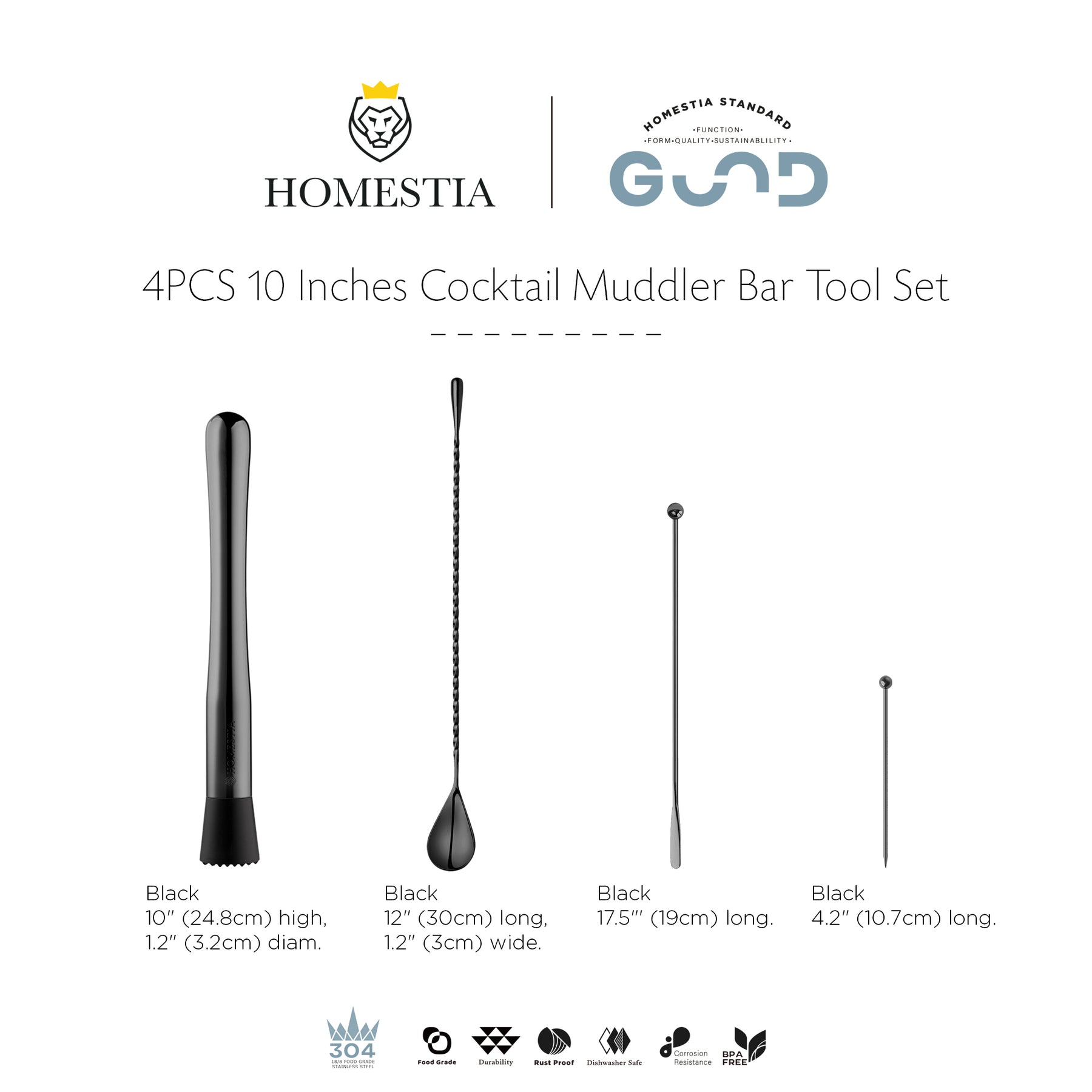 Homestia 4PCS Stainless Steel Black Cocktail Muddler Set, Bar Spoon, Swizzle Stick, Cocktail Pick