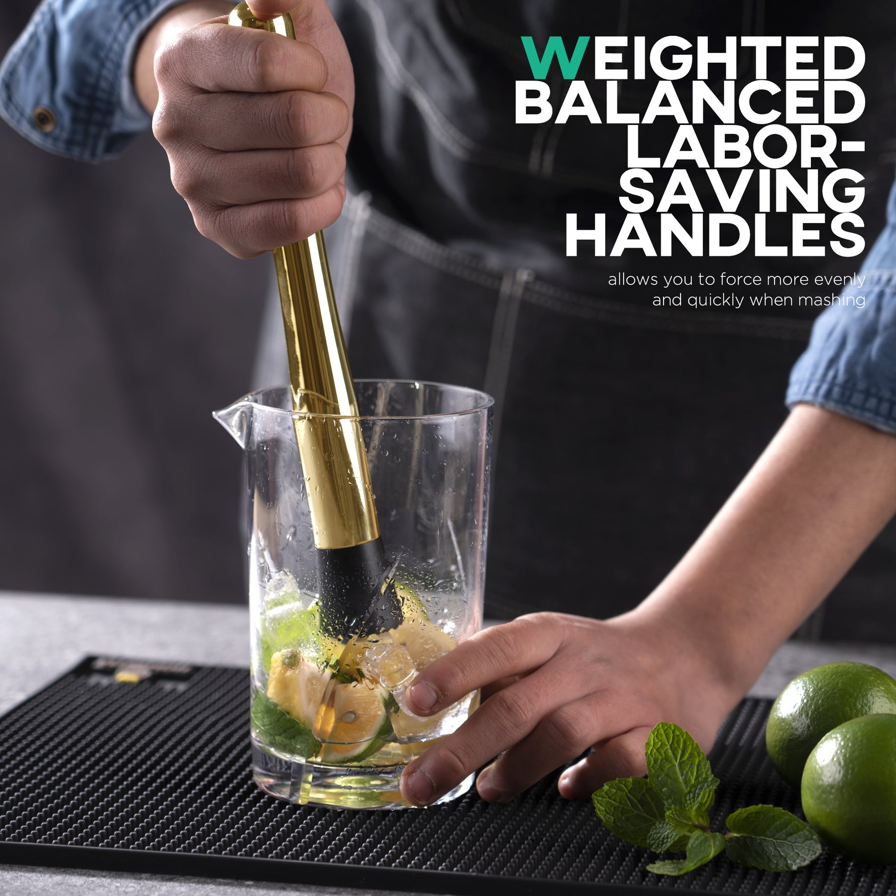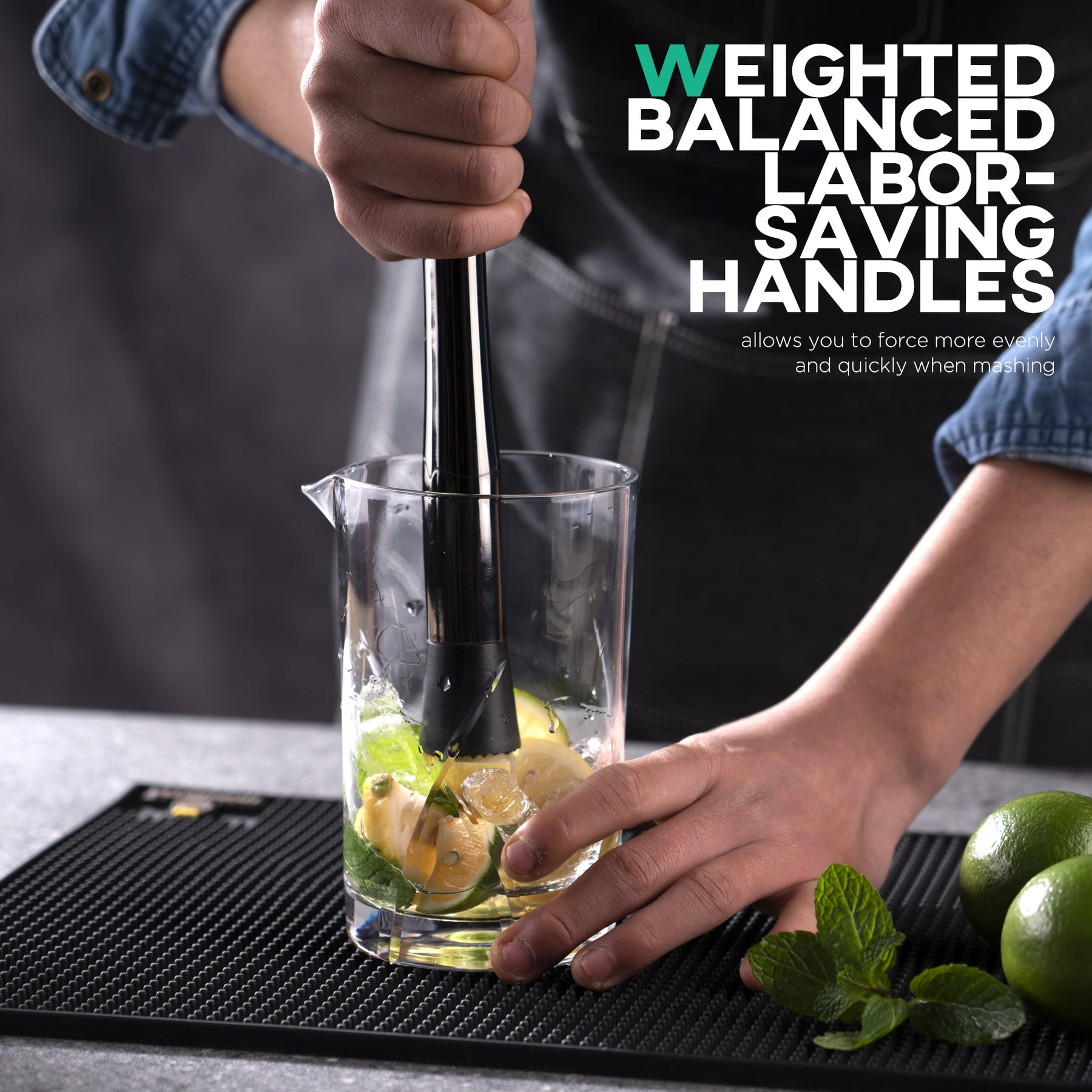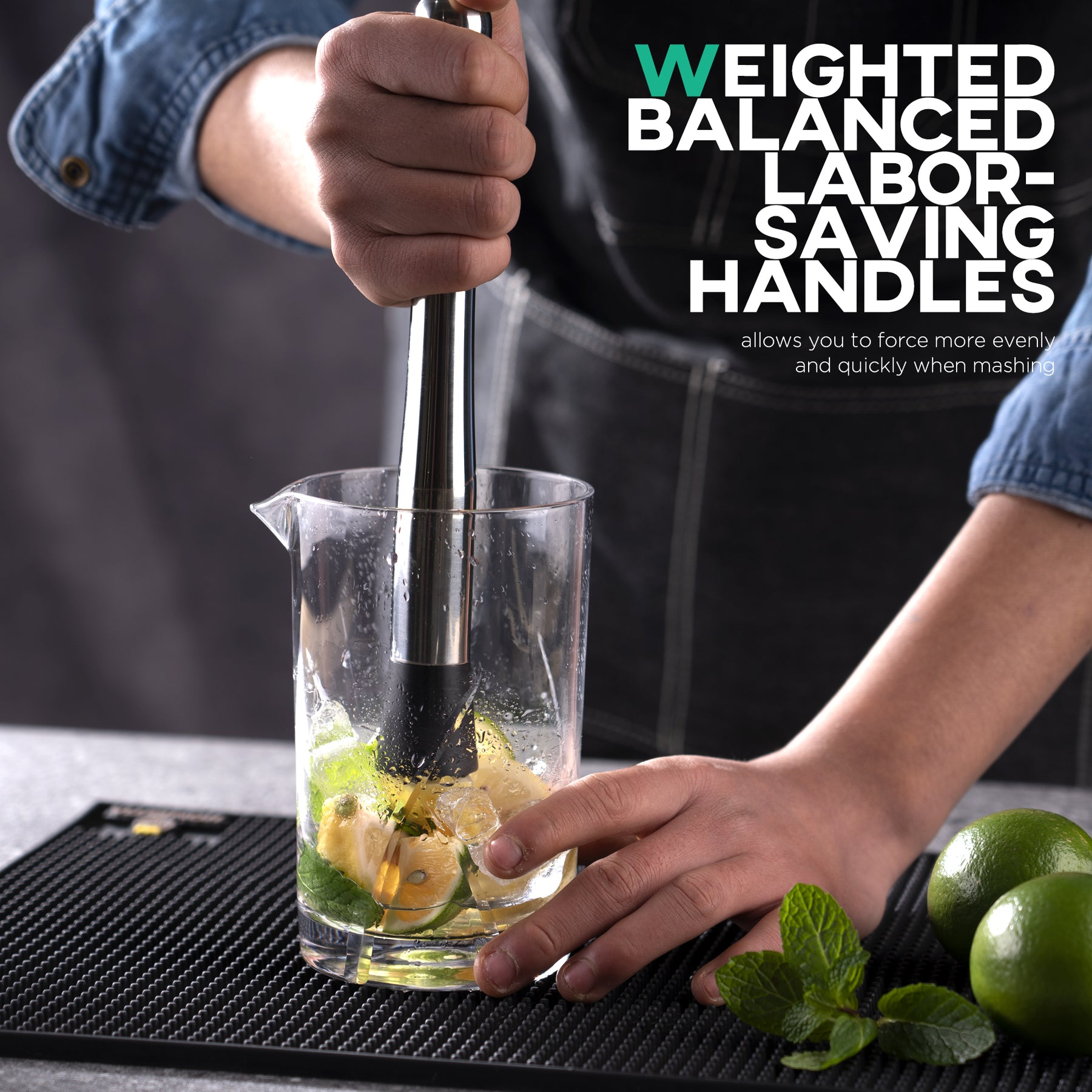 Use the end to blend citrus fruits, mint, or extract juices and aromatic oils from fruits and herbs. An essential tool behind any commercial or home bar.