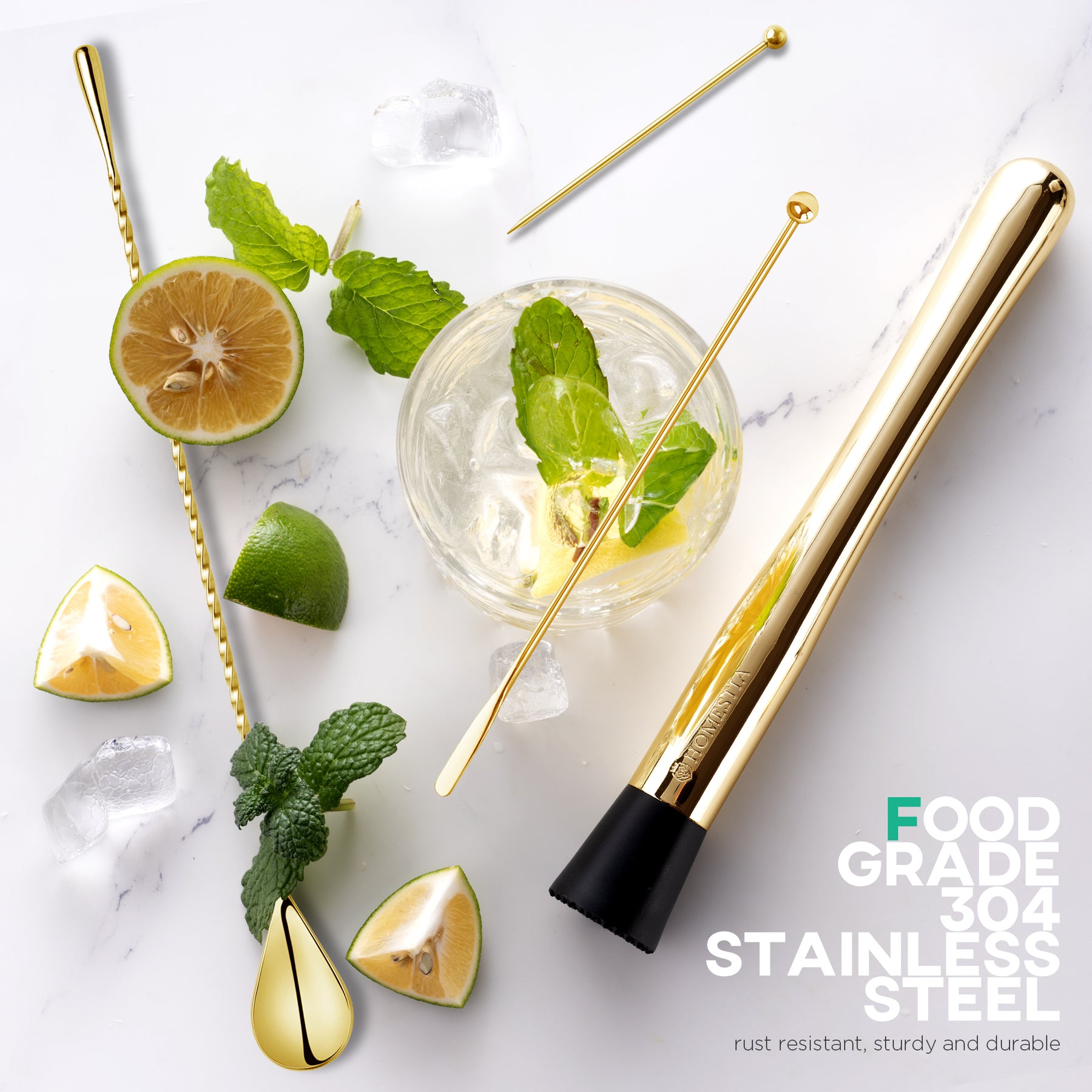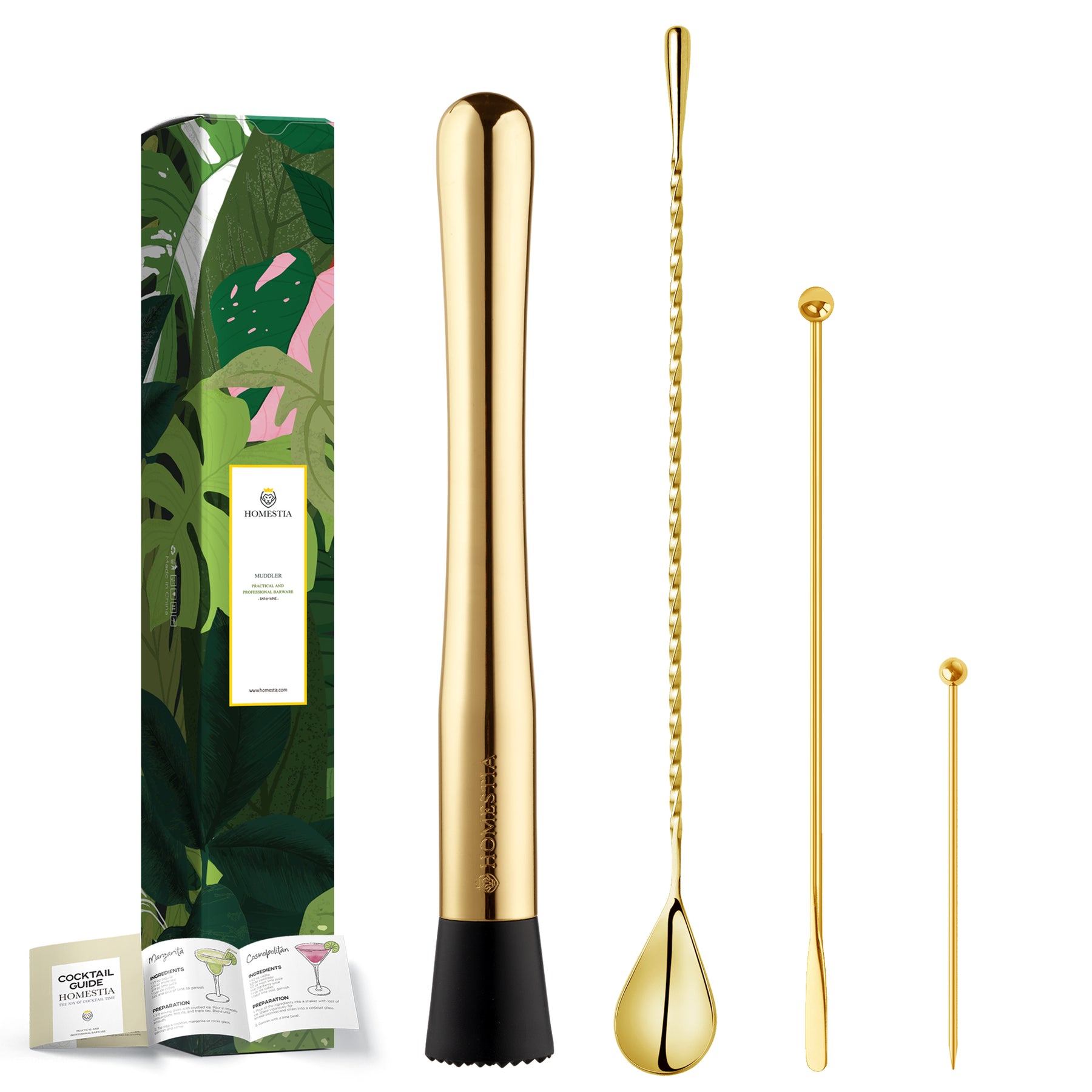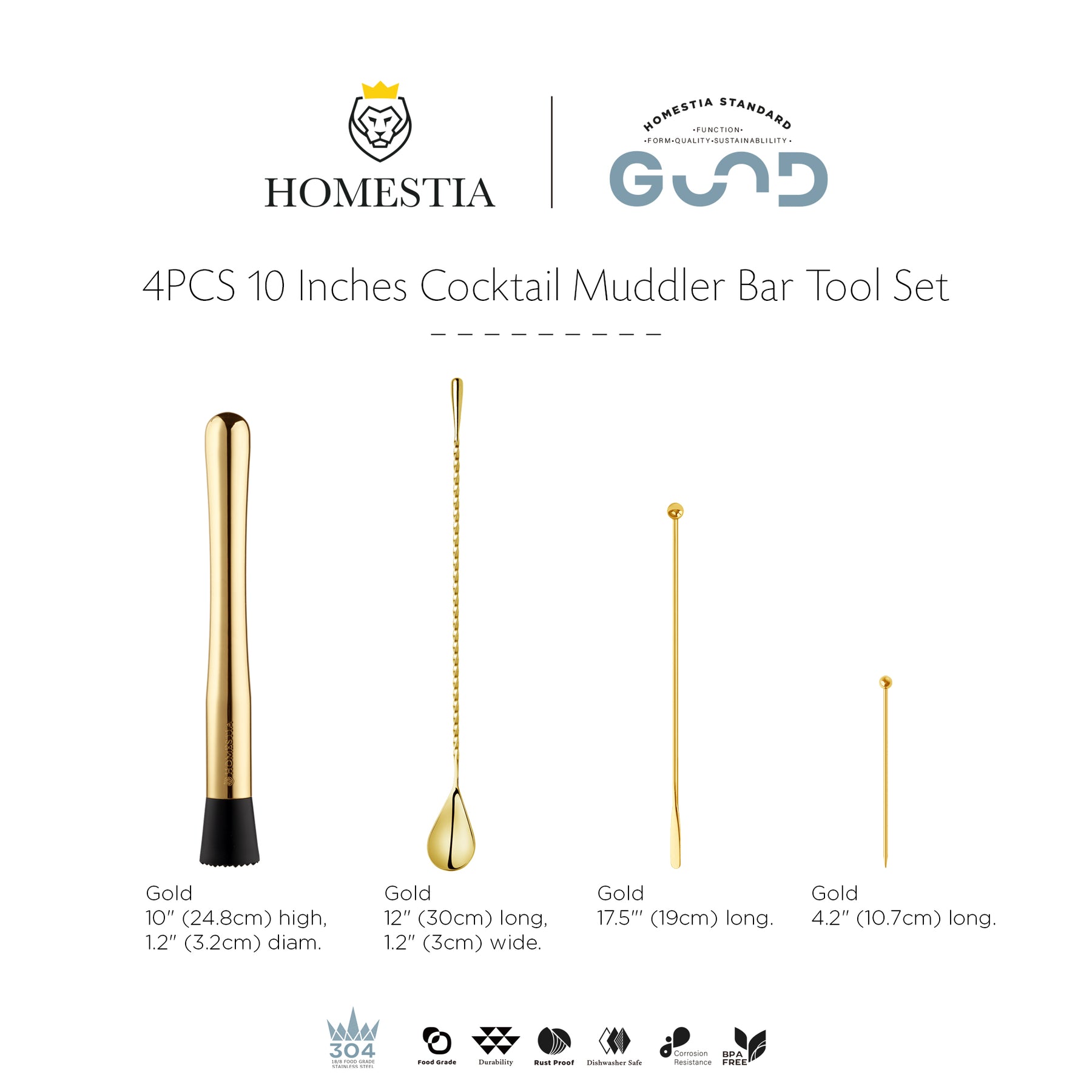 Homestia 4PCS Stainless Steel Gold Cocktail Muddler Set, Bar Spoon, Swizzle Stick, Cocktail Pick