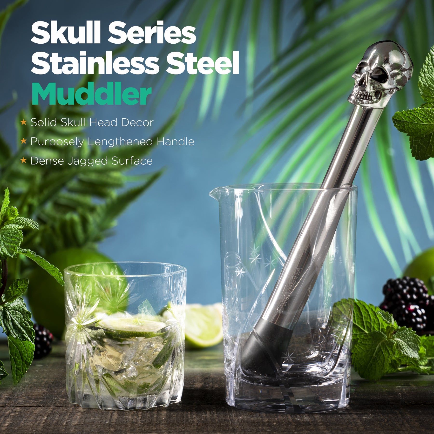Exquisite zinc-alloy skull sculpture head, timeless classic gothic style. Polished stainless-steel handle, long enough to muddle in your shaker tin. A full 10" long and ergonomically-shaped, our muddler is going to be a trusty mashing friend for you.