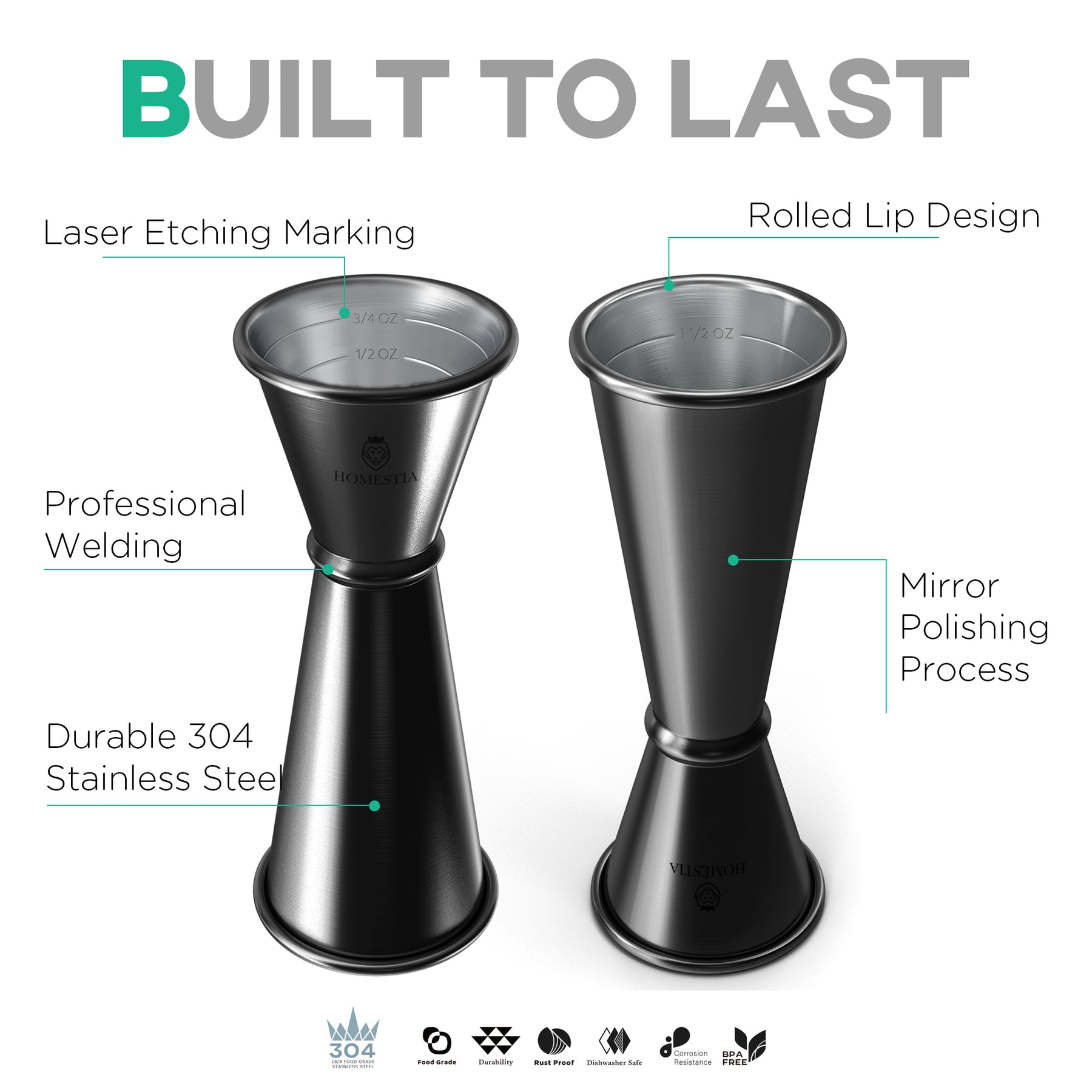 • Bar Jigger * 1: 4.8" (12.2cm) high, 1.8" (4.5cm) diam., 1-oz&2-oz (30ml&60ml). cap.