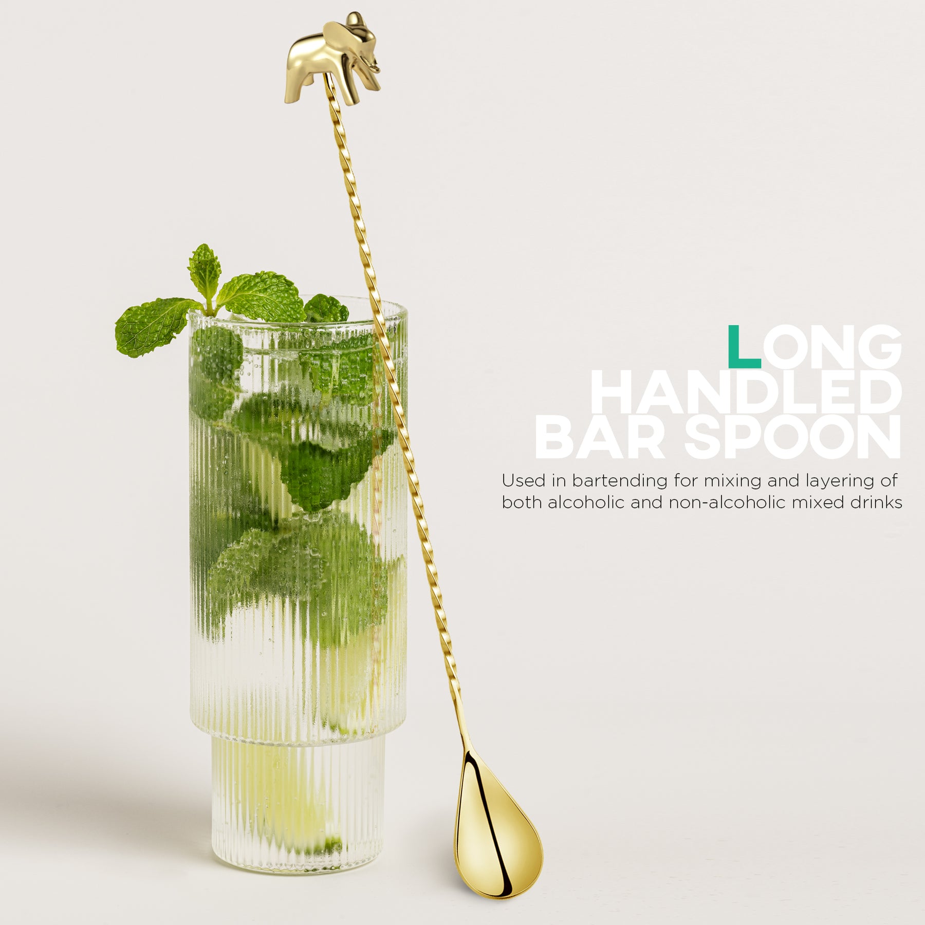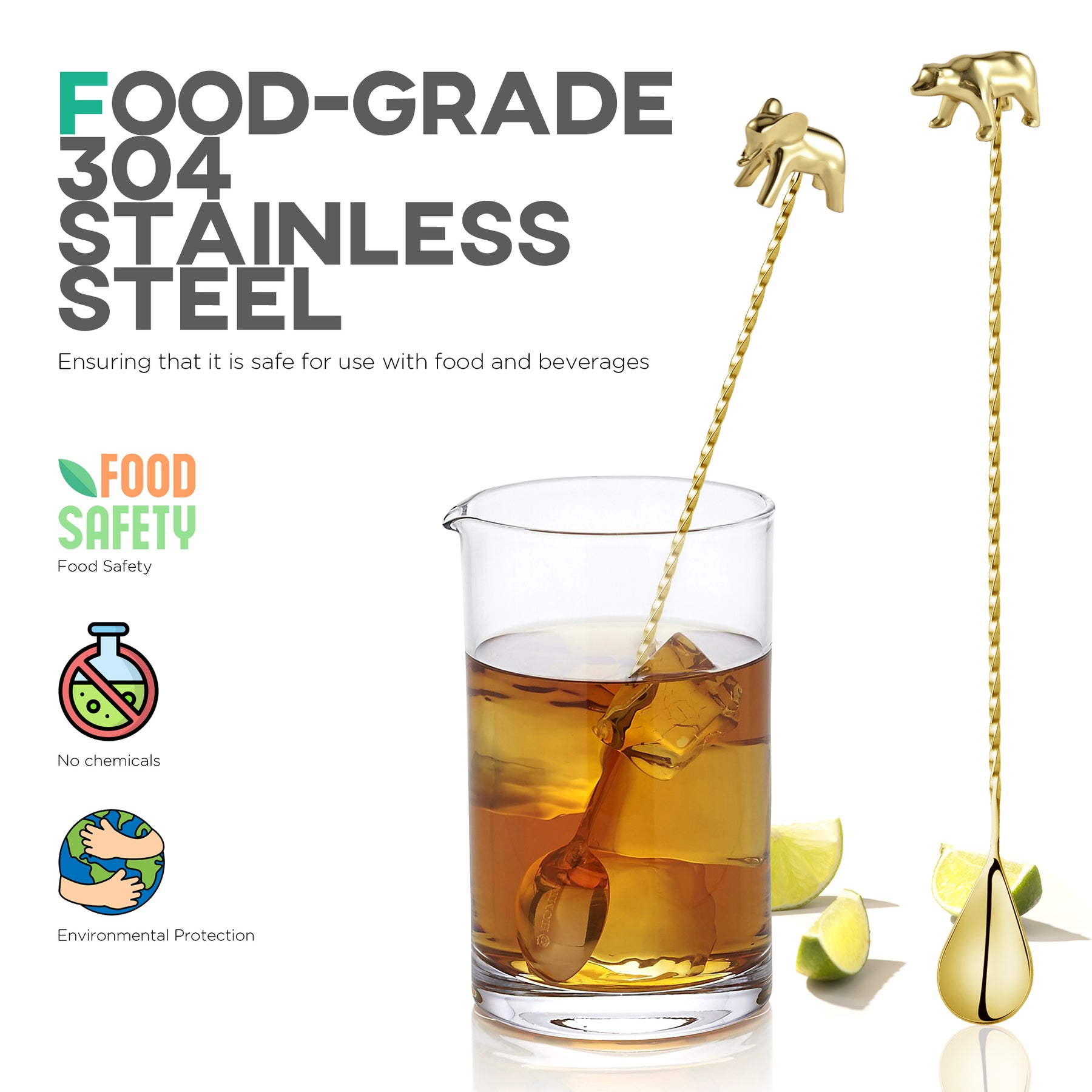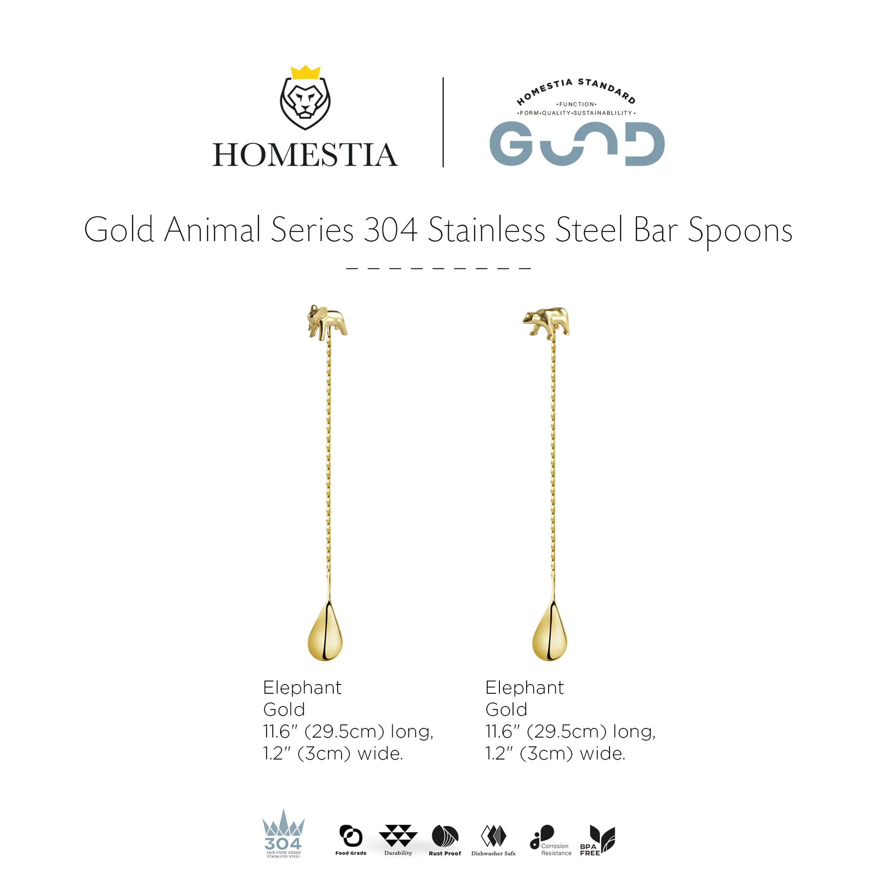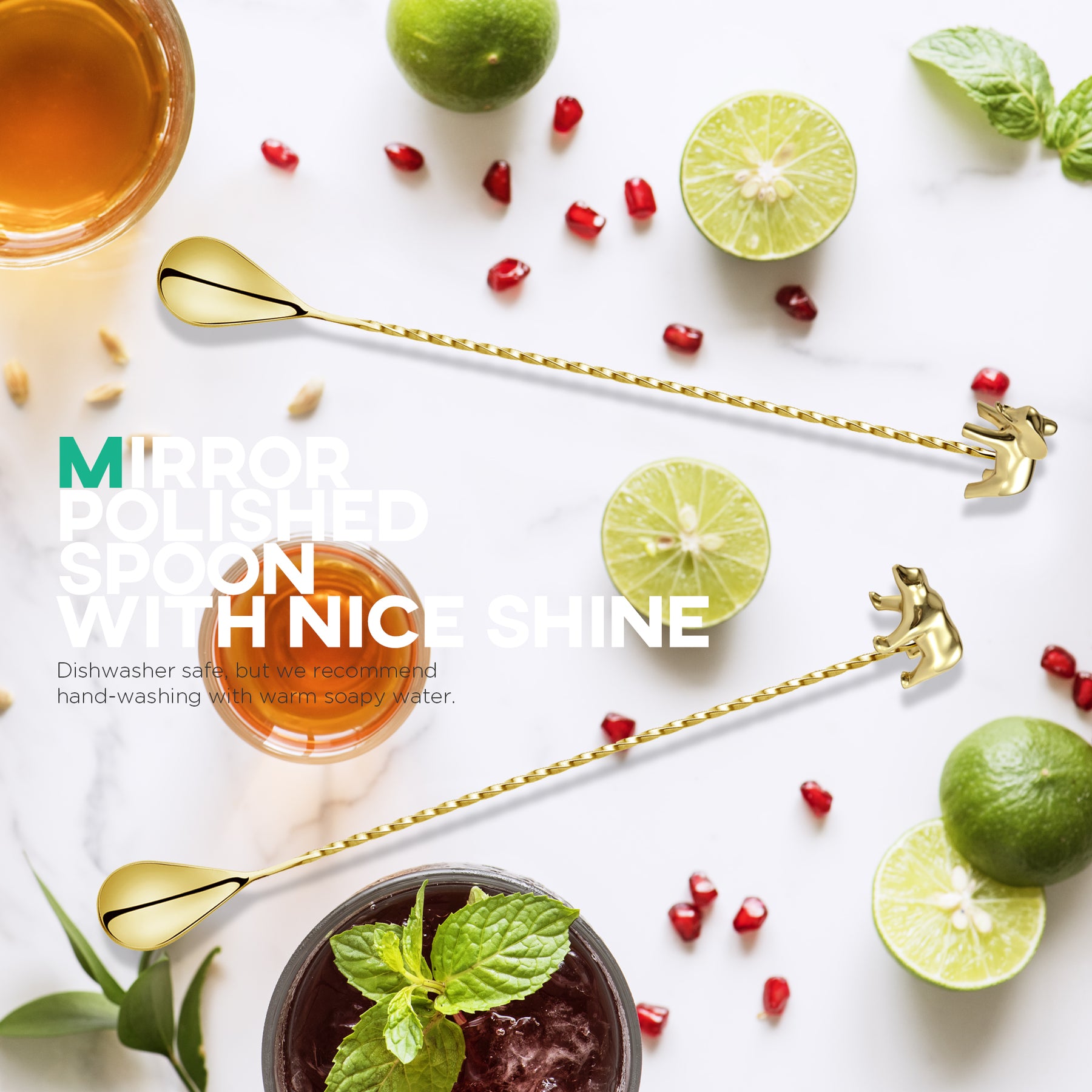 Extra long handle but exquisite, these bar spoon is beautifully detailed with elephant and bear finials.